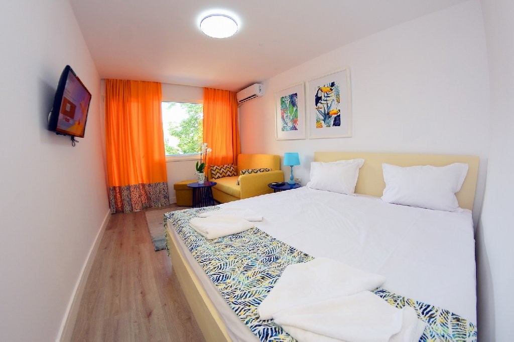 Camera dubla matrimoniala a cuprinde un spatiu deschis cu o suprafata de 18 mp, zona pentru dormit cu un pat matrimonial, cu sau fara canapea extensibila 134cm*194cm, baie cu dus, balcon.